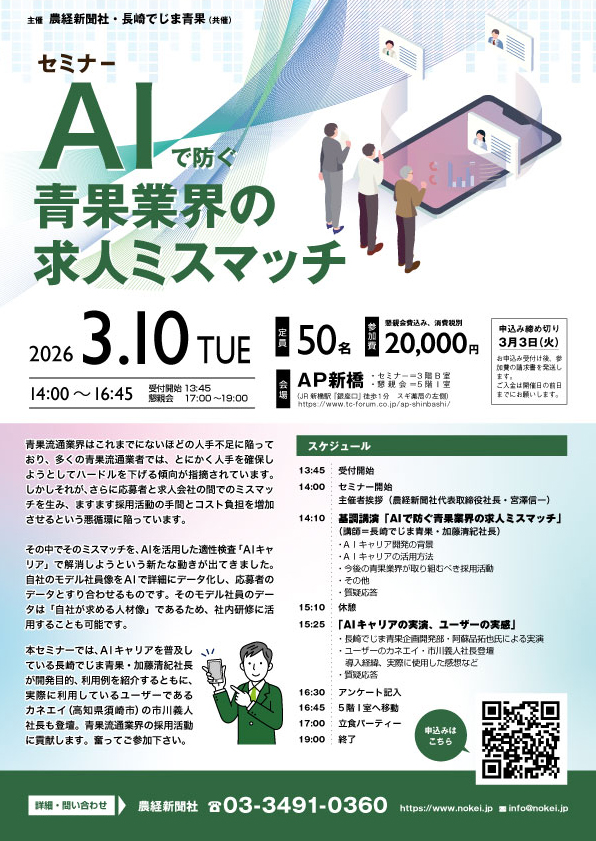 HOMEギャラリー 新着情報 2026/3/10(火)セミナー(AIで防ぐ青果業界の求人ミスマッチ)を開催予定です。参加ご希望の方は画像をクリックし申し込みフォームよりお申し込みをお願いいたします。 バックナンバー(CM・番組) NCC長崎文化放送長崎市中央卸売市場で初競り「長崎でじま青果」2社統合効果に期待も NBC長崎放送「長崎大水害のときのお礼を」長崎でじま青果が能登半島地震の義援金贈呈 NCC長崎文化放送「大水害支援の恩返しを」長崎でじま青果が被災地支援に義援金贈呈